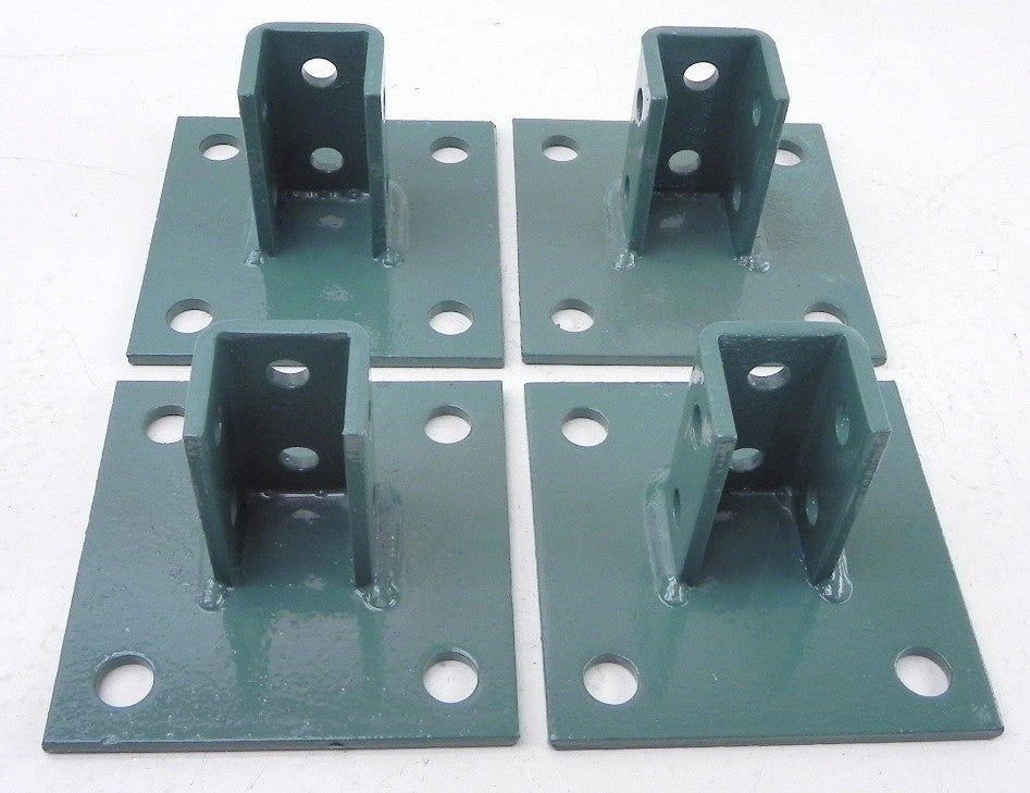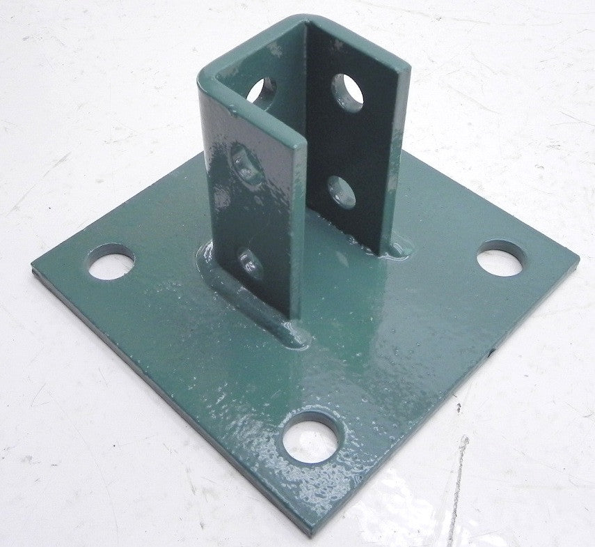 Specifications: Superstrut post base: 1/4" thick. Base 6" x 6", 3/4" dia. holes. Post height: 3-1/2". Post wide: 1-5/8" int., 1/2" holes. Epoxy coated Green Guard. Lot of 4 parts.